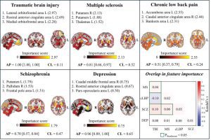 Different conditions (MS, schizophrenia, depression, chronic low back pain, traumatic brain injury) are characterised by distinct sets of brain regions whose network connections drive diagnostic classification.